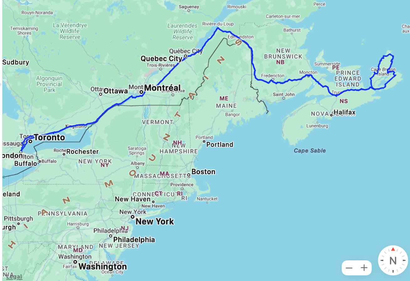 Our road trip in September 2024. The Cabot Trail is the major point of interest. Upon returning to Quebec City we pause for a 20 day cruise to Boston and back before we drive the last leg back to home.